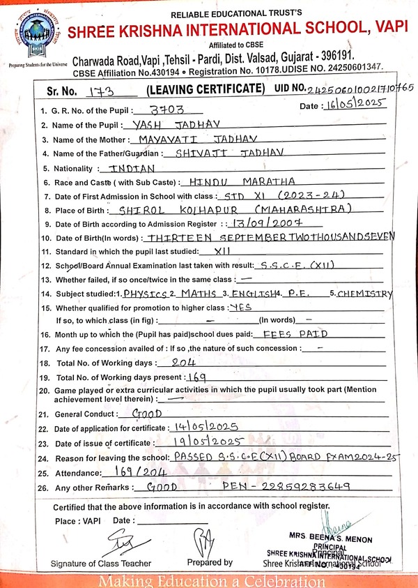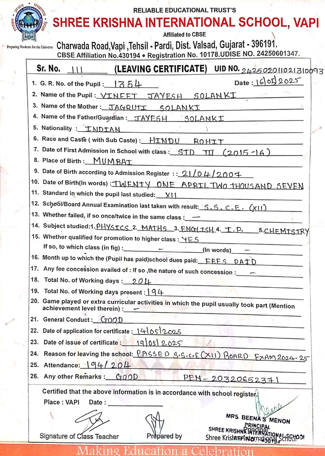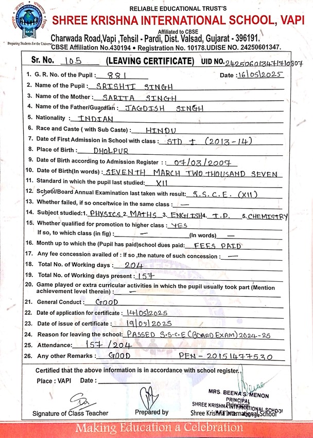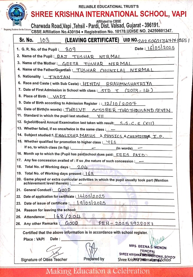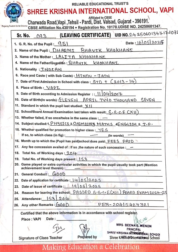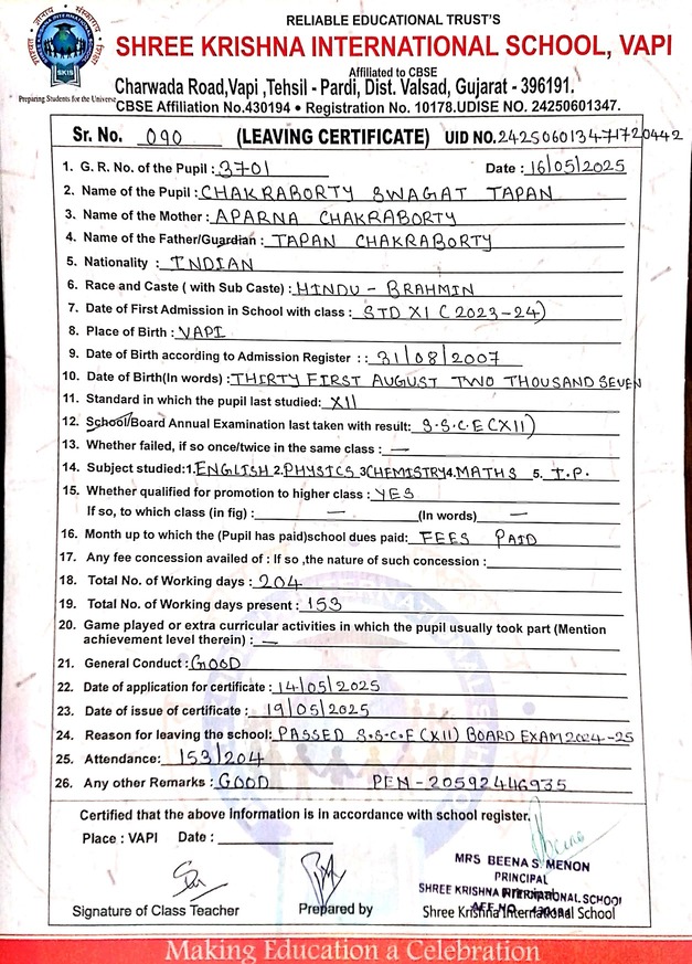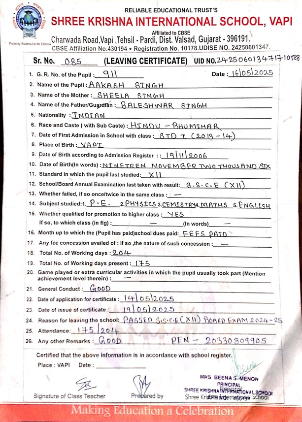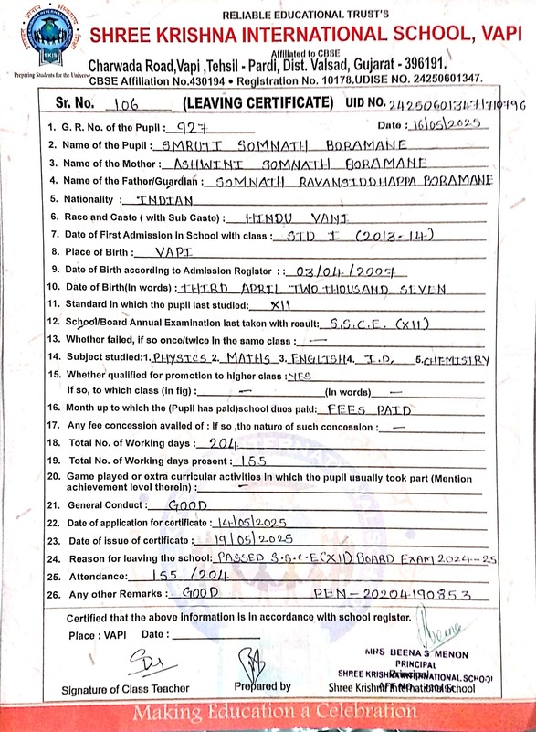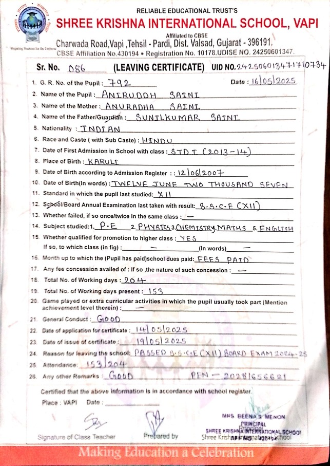Below is the list of students with their living certificates issued by Shree Krishna International School. Click any image to open the full certificate.
