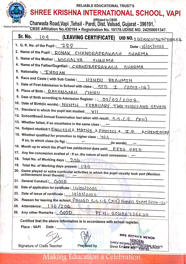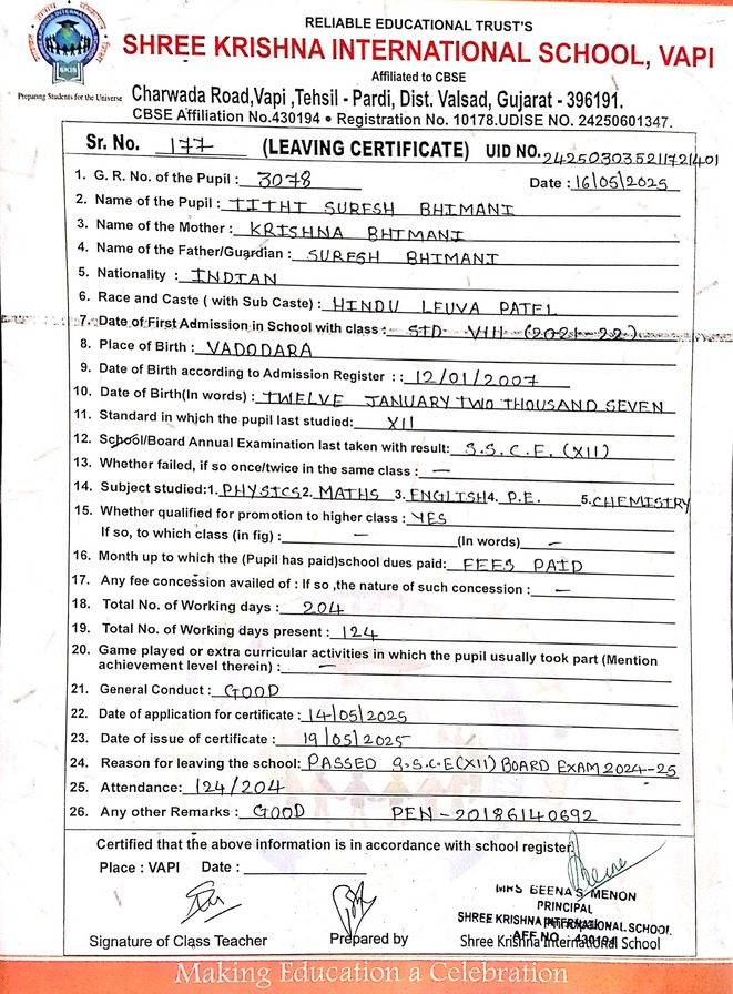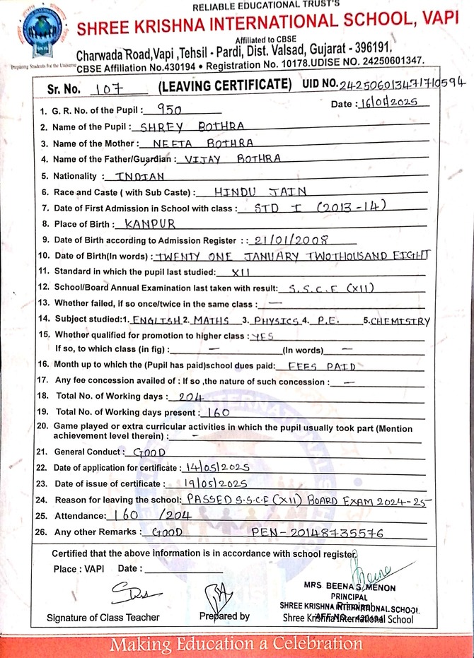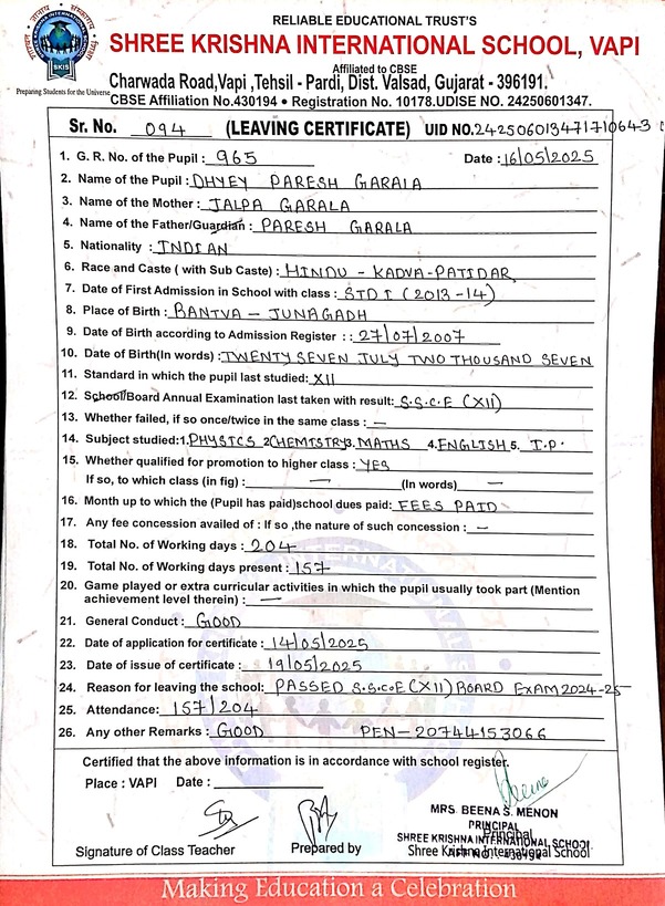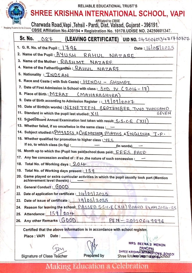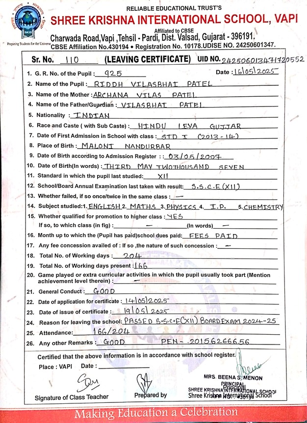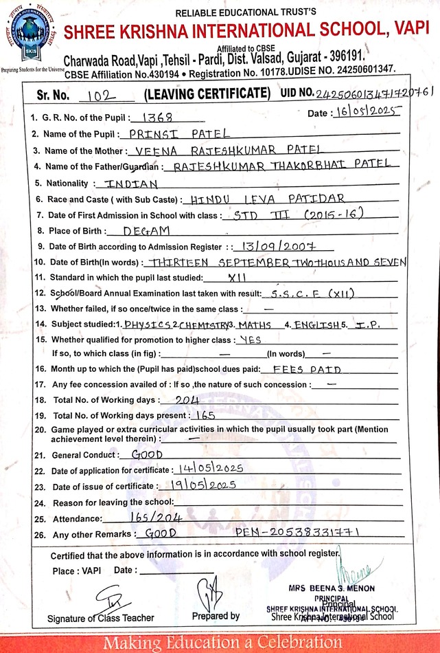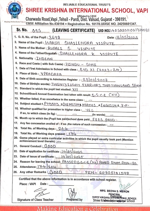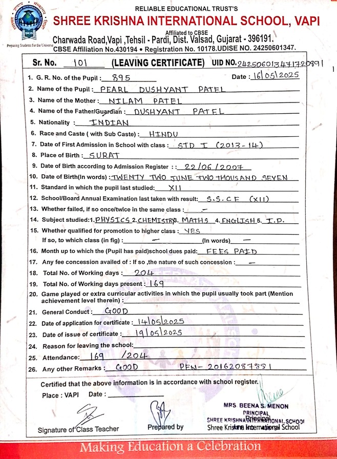 Below is the list of students with their living certificates issued by Shree Krishna International School. Click any image to open the full certificate.