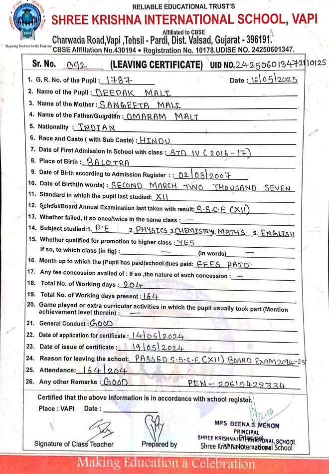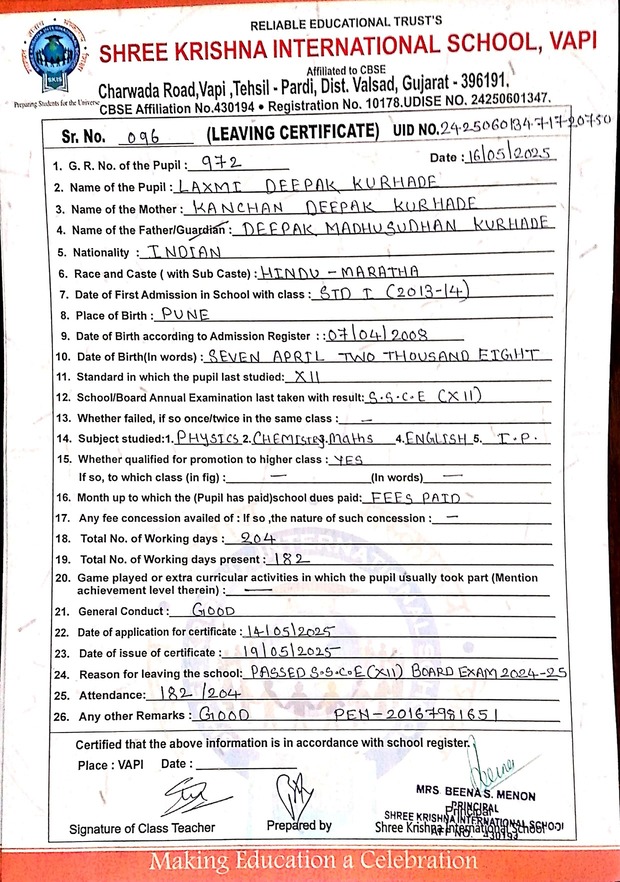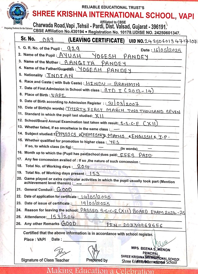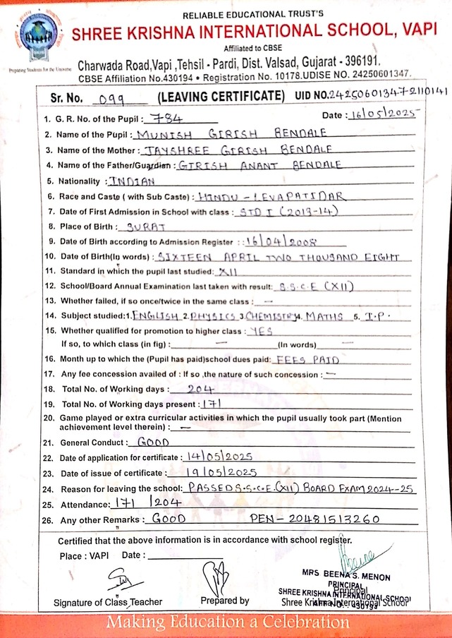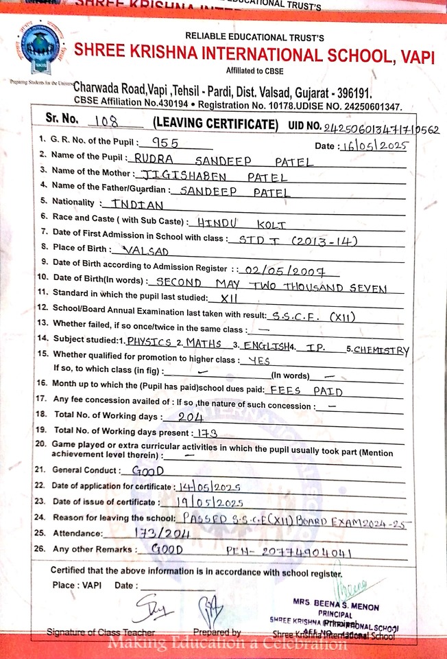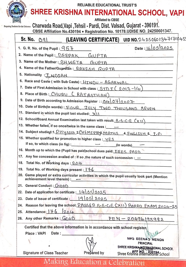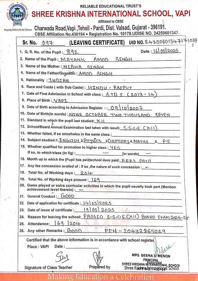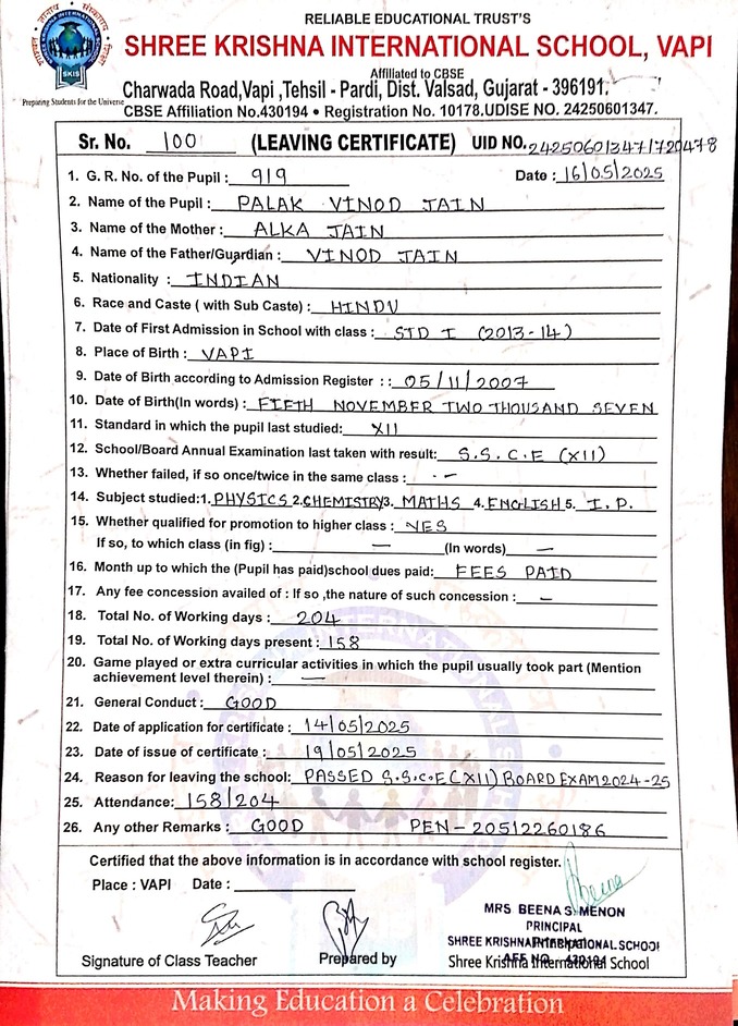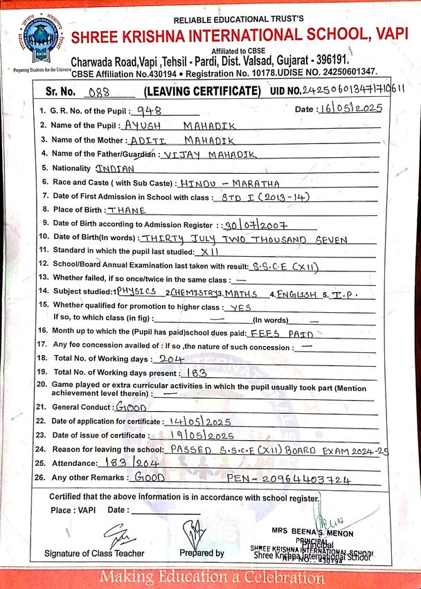 Below is the list of students with their living certificates issued by Shree Krishna International School. Click any image to open the full certificate.